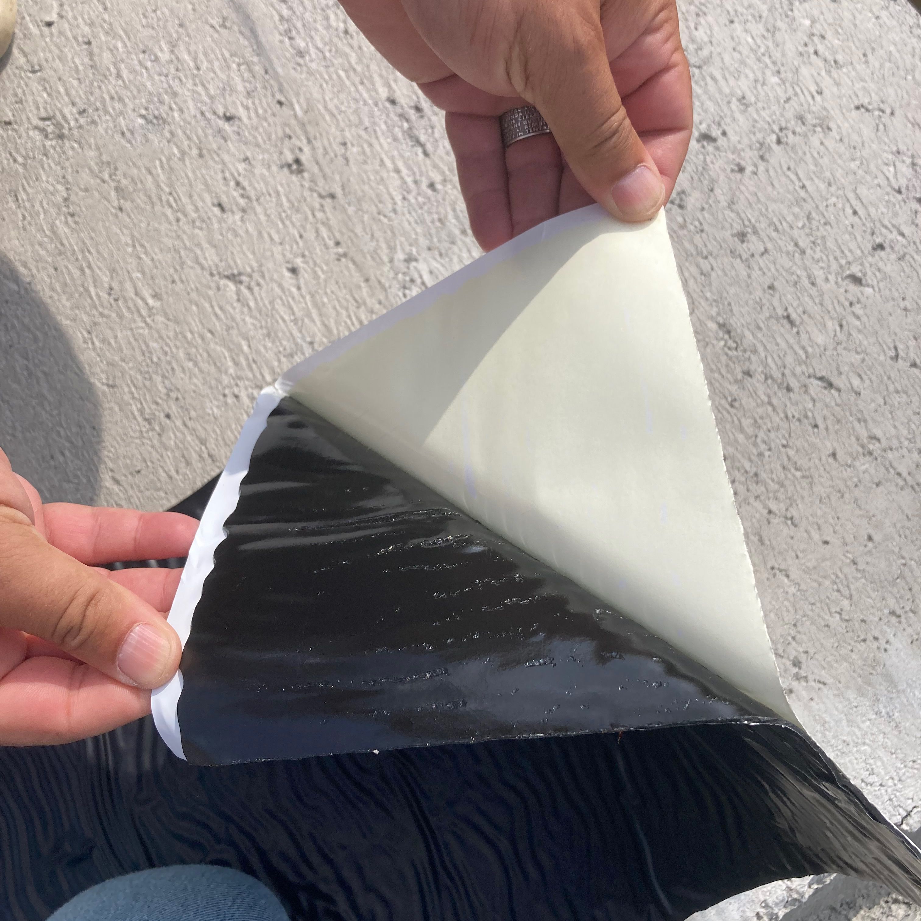 La seconda guarnizioni viene esternamente al manufatto a copertura del gap che resta tra i due manufatti. La fascia ha dimensione di 20 cm di larghezza e presenta una superficie adesiva che aderisce perfettamente alla superficie del calcestruzzo. Tale faccia per motivi operativi e di montaggio può essere installata solo sui tre lati liberi del manufatto (come si evince nelle foto sottostanti).