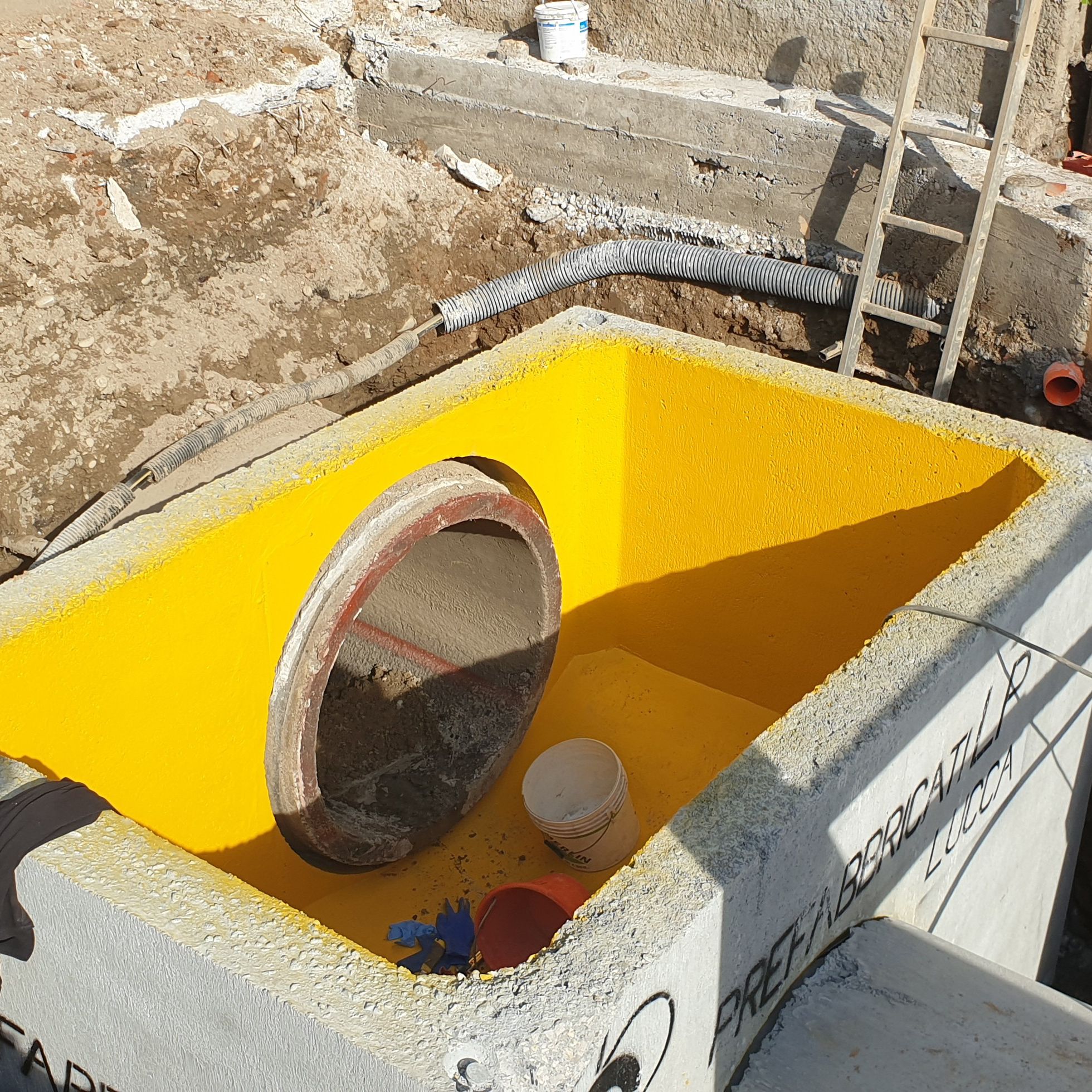 La fognatura è realizzata per un primo tratto con scatolari in cls 120x100 lu 200cm, un secondo tratto con tubi in cls DN1000 lu 200 cm. Tutti i manufatti forniti sono internamente rivestiti con LINER POLIOLEFINICO ANTICOR spessore 3 mm.