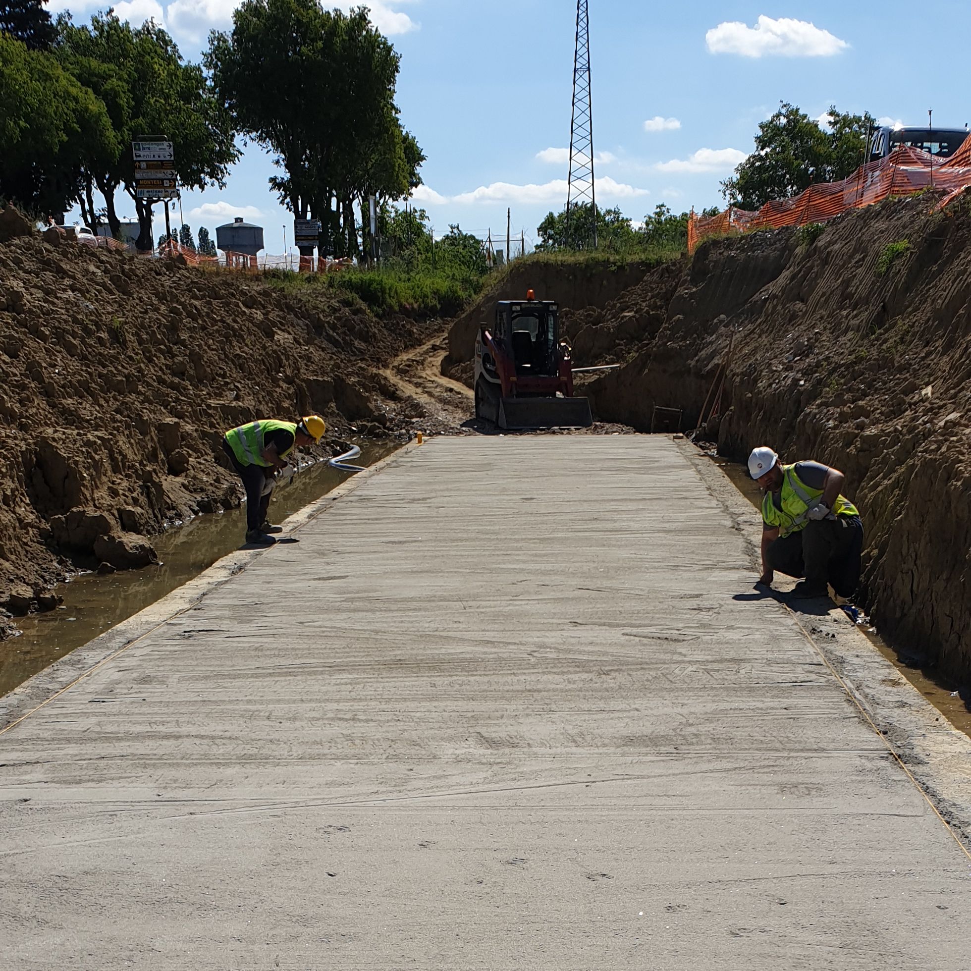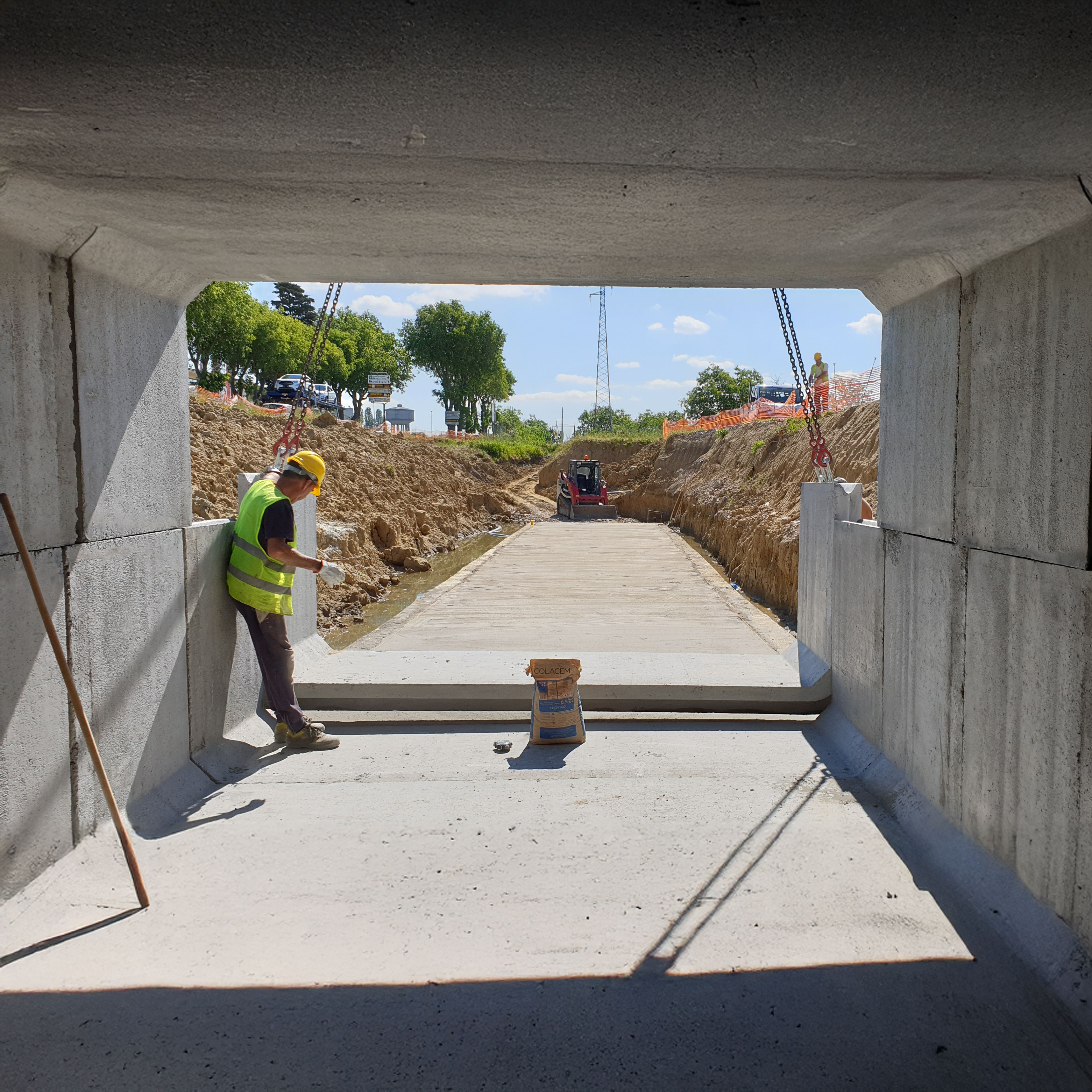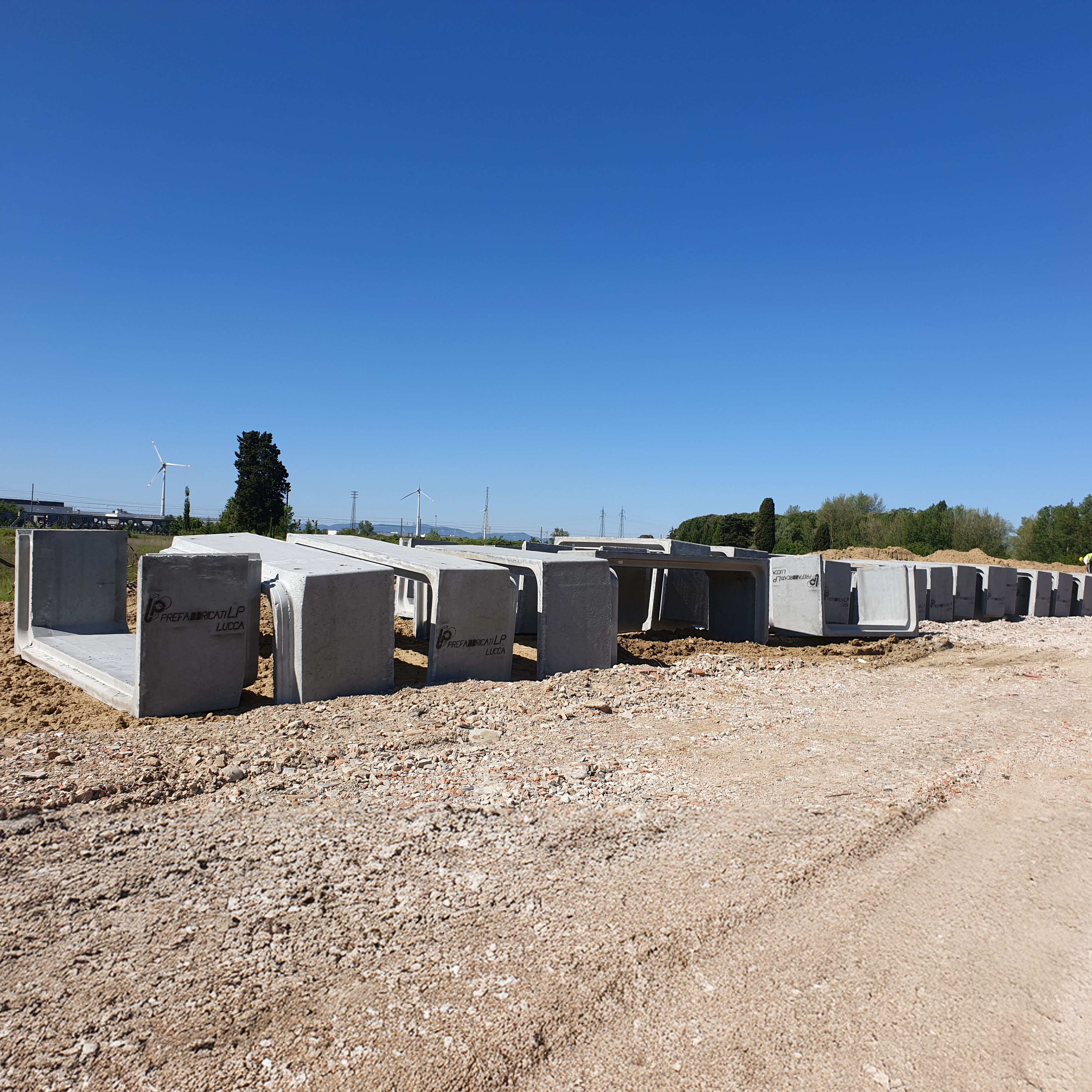 I manufatti sono stati prodotti dalla Prefabbricati LP e installati presso il cantiere di Pontedera, in via Tosco Romagnola dall’impresa COGEB Srl di Roma per la realizzazione del passaggio idraulico del “Fosso Vecchio” al di sotto della nuova rotatoria.